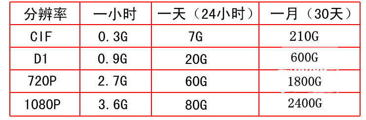 一般CIF格式一路一小時 225MB,D1格式的一路一小時900MB,720P格式的一路一小時1360MB